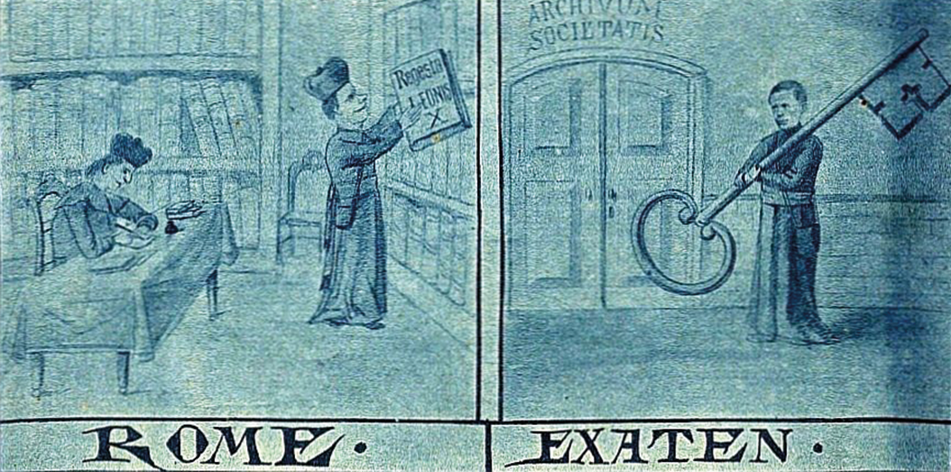 Immagini estratte da un cartoncino satirico del 1896 redatto in occasione dei 60 anni di Compagnia dell’allora custos archivi