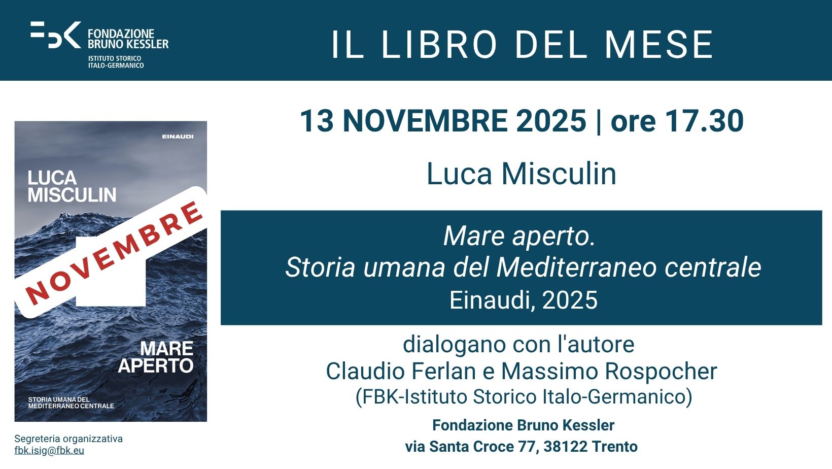 In occasione della presentazione, l’autore sarà intervistato da Claudio Ferlan e Massimo Rospocher, per un approfondimento sulle sfide e le storie che hanno fatto del Mediterraneo il crocevia del mondo.